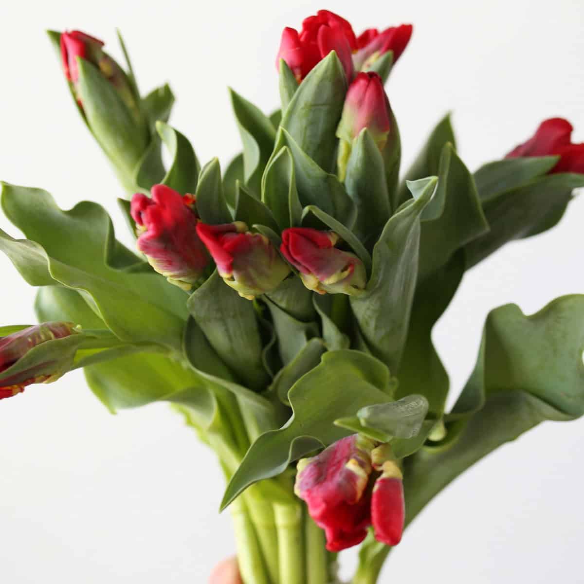 Make a bold statement with our Seadov Parrot Tulips, showcasing dramatic, ruffled red petals accented by subtle hints of green. Carefully cultivated for exceptional freshness, these premium tulips add a captivating burst of color and texture to any arrangement. Perfect as a striking centerpiece or a thoughtful gift, their flamboyant blooms exude confidence and elegance.